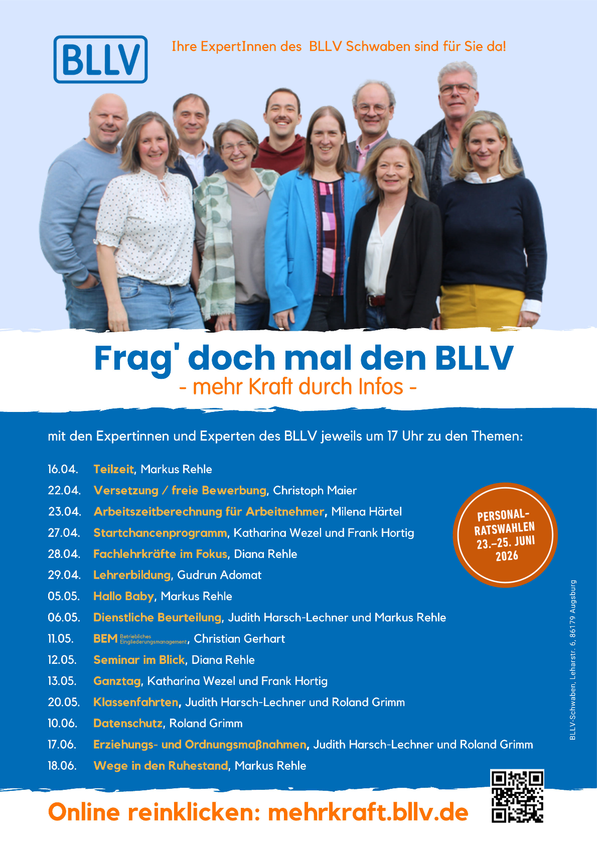 Lust auf frische Impulse, spannende Infos und Antworten aus erster Hand? Dann schauen Sie bei unserer Online-Fortbildungsreihe „Frag doch mal den BLLV“ vorbei. Unsere Expertinnen und Experten des BLLV liefern Wissen mit Mehrwert und bestimmt ein bisschen mehr Kraft für den Alltag.