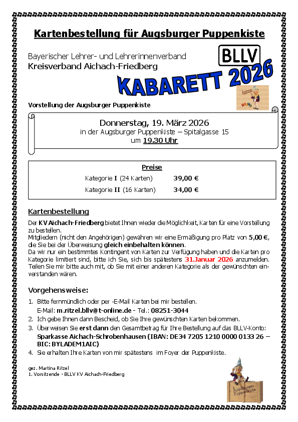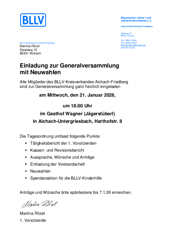 Die Generalversammlung des Kreisverbandes Aichach-Friedberg findet am 21.01.2026 (ab 18 Uhr) in Aichach-Untergriesbach (Gasthof Wagner) statt! Bitte anmelden! Weitere Infos hier!