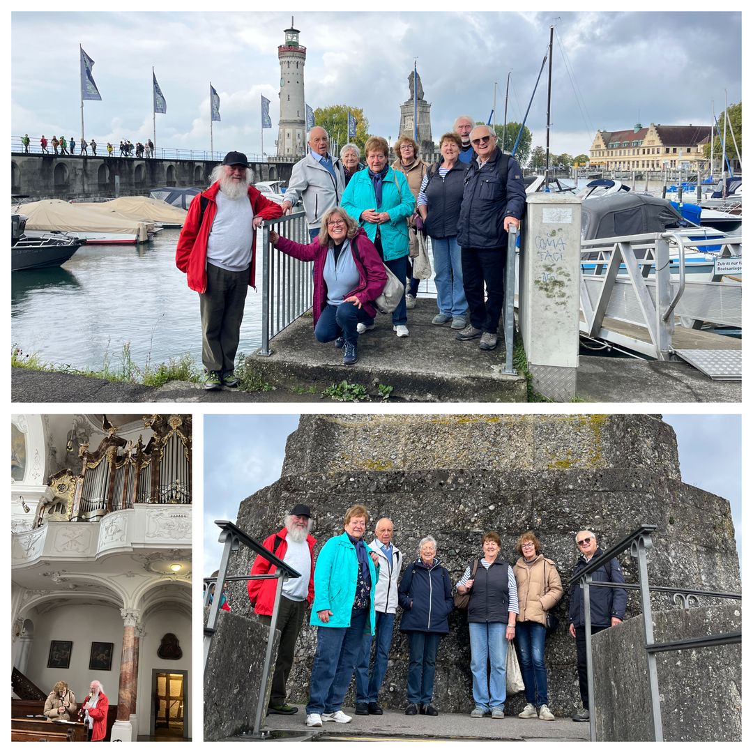 Durch Krankheit dezimiert machte sich Ende September nur eine Kleingruppe Pensionisten mit der Bahn auf den Weg nach Lindau. Unser Programm sah vor, die Hundertwasser – Ausstellung zu besuchen und dann über den See und mit der Seilbahn auf den Pfänder zu fahren. Gleich bei der Ankunft sahen wir, dass sich wegen des trüben Wetters und den tiefhängenden Wolken die Fahrt auf den Pfänder nicht lohnen würde. So begannen wir mit einem Stadtrundgang. Wir schlenderten die Hafenpromenade entlang, erklommen die Stufen zum Löwen an der Hafeneinfahrt, und spazierten quer durch die Altstadt bis zum Münster „Unserer lieben Frau“. Hier zog unser Hausmusiker Alfons Lang plötzlich aus den Tiefen seines Rucksacks Musiknoten und Flöte hervor und spielte zusammen mit Angela Orendi das „Andachtsmenuett“ von Lorenz Maierhofer. Die Musik war so ergreifend und passte so gut an diesen Ort, dass auch die anderen Besucher still verharrten, bis die letzten Töne des Musikstückes verklungen waren. Nach einem schmackhaften Essen im Restaurant „Engel“ bestiegen wir ein Ausflugsboot und machten eine Rundfahrt auf dem Bodensee, die allen Teilnehmern gut gefiel, obwohl das Wetter immer noch nicht optimal war.