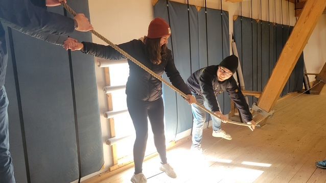 Im zweiten Teil des Tages ging es in die Kletterhalle. Zum Aufwärmen spielten wir eine lebhafte Variante von „Schere, Stein, Papier“, bei der man sich vom Ei, über das Küken, den Dinosaurier, den Affen bis hin zum Menschen „hocharbeiten“ konnte. Im Anschluss folgte eine der anspruchsvollsten Aufgaben des Tages: Wir mussten als Gruppe gemeinsam über gespannte Seile balancieren, um das Ziel zu erreichen – ohne dabei den Boden zu berühren. Dabei war eine gute Kommunikation entscheidend, um ein gemeinsamen Vorgehen abzustimmen. Obwohl wir mehrere Anläufe benötigten, fanden wir durch eine kreative Idee schnell eine funktionierende Strategie und meisterten die Aufgabe schließlich mit Erfolg. Zum Abschluss des Tages gingen wir noch einmal nach draußen, um ein Geschicklichkeitsspiel zu absolvieren. Dabei erhielt jede Person ein Seil, das an einem gemeinsamen Haken befestigt war. Mit vereinten Kräften mussten wir versuchen, Holzblöcke mit diesem Haken aufzunehmen und daraus einen möglichst hohen Turm zu bauen.